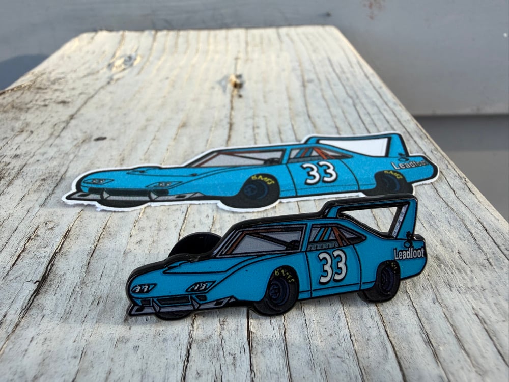 This is the latest of my pin line, as well as my first BMFS pin. These are a play on the Richard Petty Superbird. The white text is glow in the dark, red in color.